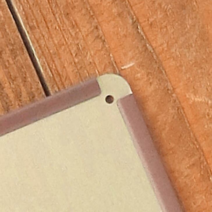 4隅に丸穴が開いていて、針やピンなどですぐに壁に貼れます。