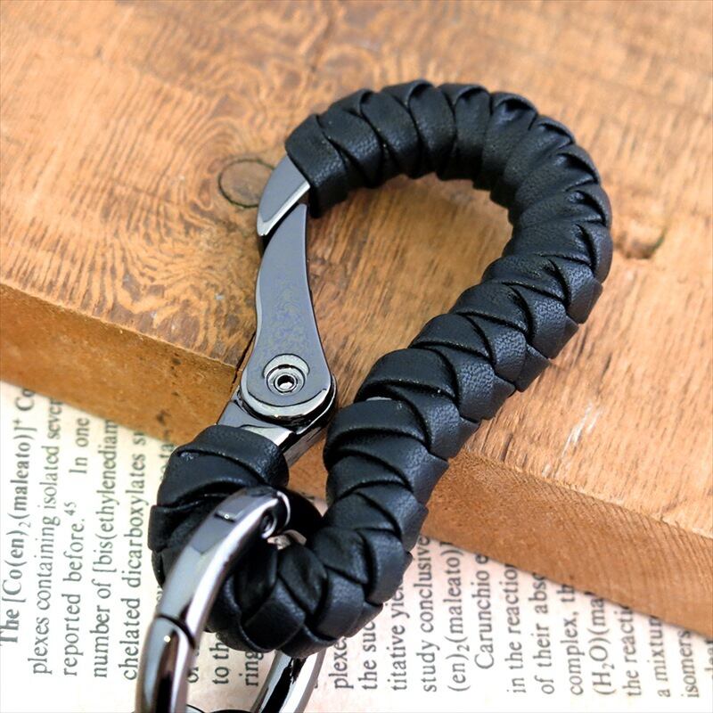 丸みのあるシンプルなカラビナに編み込みレザーを巻き付けて、男らしさを演出しています。